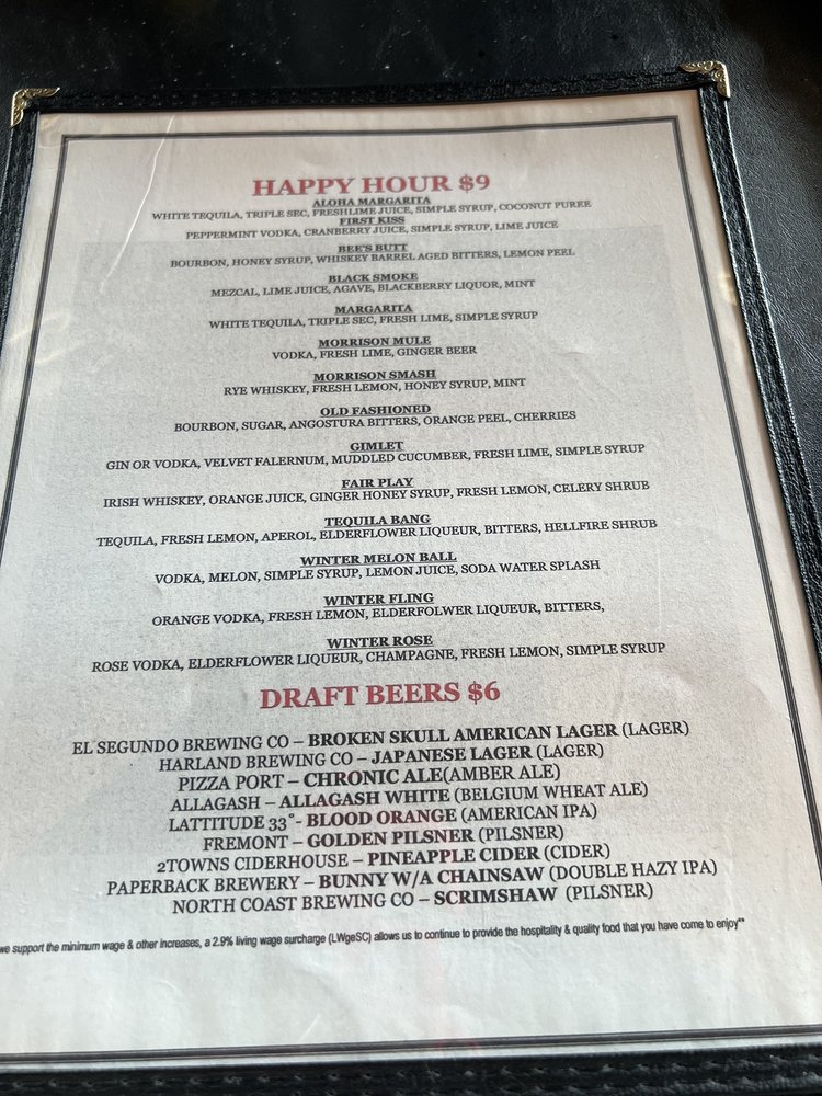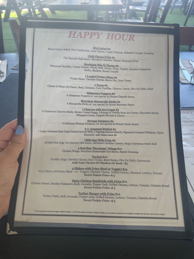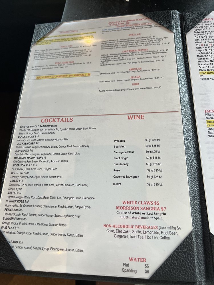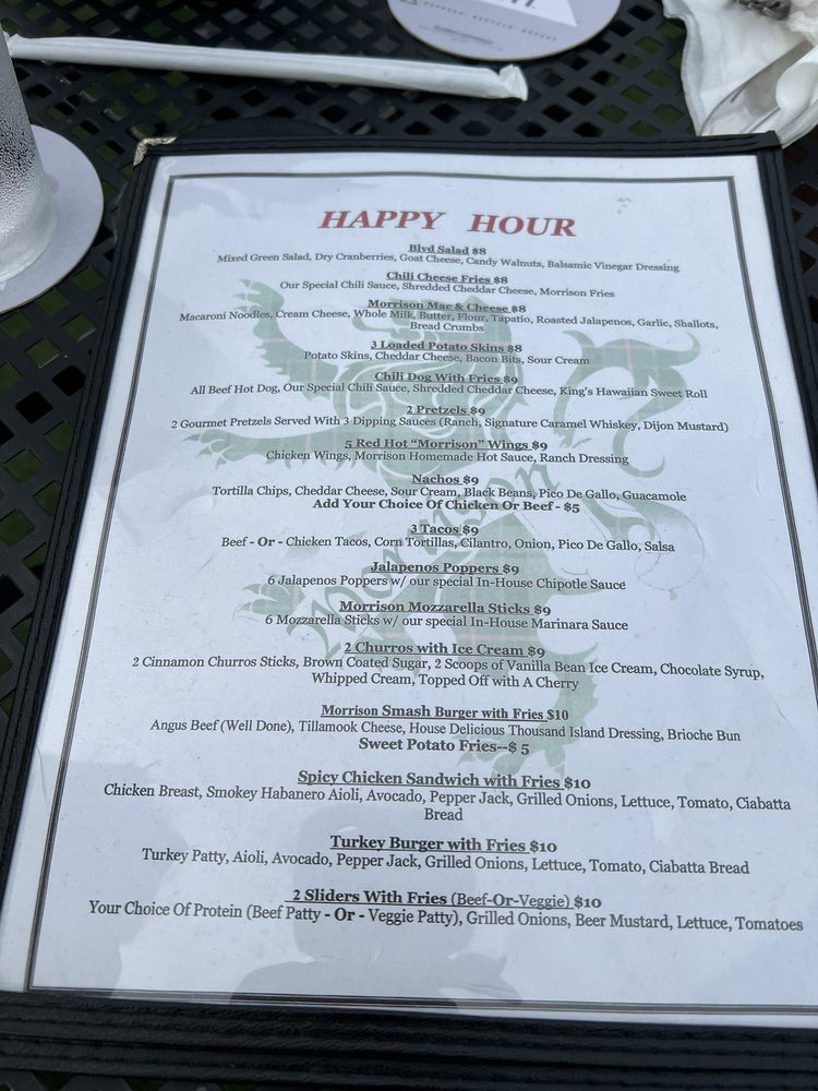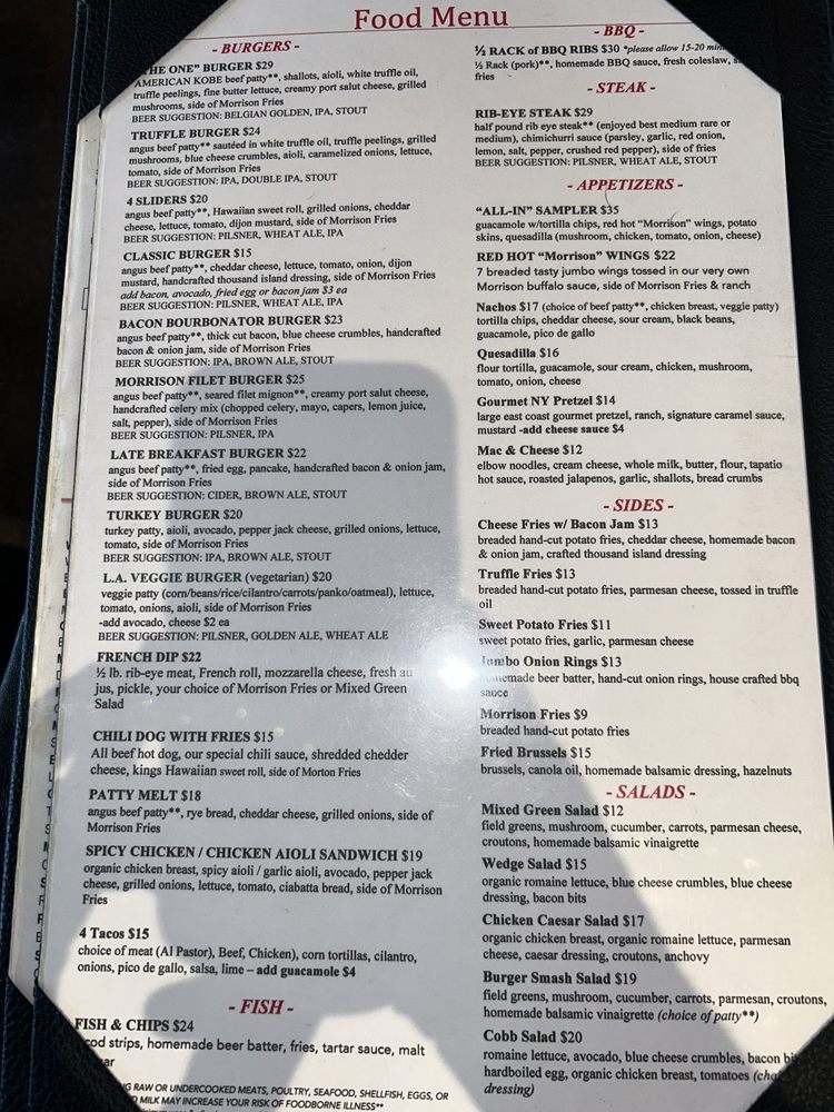 Introducing the menu at Morrison - Burbank, a Latinx and women-owned gastropub in Burbank, CA offering a diverse range of options. From burgers to New American dishes, this restaurant has something for everyone. The menu features vegan and vegetarian choices, along with happy hour specials and a full bar. Customers praise the friendly service, outdoor seating, and pet-friendly atmosphere. Whether you're looking for a casual dinner or a fun happy hour spot, Morrison - Burbank has you covered. Don't miss out on their signature dishes like the French dip, spicy chicken sandwich, and mouth-watering pretzels. With convenient amenities like delivery, takeout, and wheelchair accessibility, Morrison - Burbank is a must-visit destination for delicious food and great vibes.